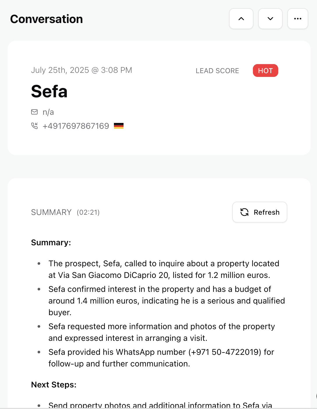 Share a recap with links, decks, and time options via SMS/WhatsApp/email — auto-logged to your CRM.
